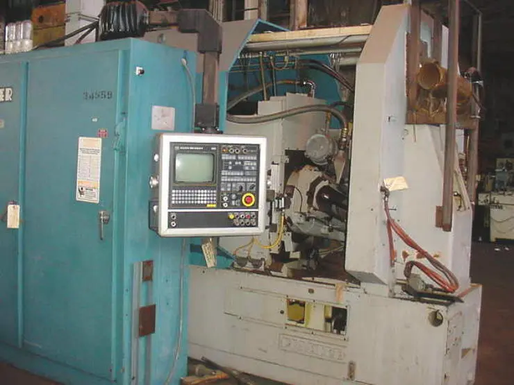 This machine was built at American Pfauter in the mid 1980's & equipped originally with an Allen Bradley 8200CNC, Bosch servo drives & motors, Heidenhain feedback systems and a Pfauter Geartronic for the Hob/Table/Helical/Tangential synchronization. In 2000, MTB retrofitted all the Bosch servos with new Indramat Ecodrives and an Indramat REFU drive for the spindle. The original Allen Bradley 8200 was retained but reprogrammed to accommodate the new servos. In this process some feedback systems were replaced by the new Indramat systems which utilize internal motor encoders. This machine has a motorized backlash free hob head powered by a liquid cooled AC Induction motor controlled by an Indramat REFU vector drive. It is also equipped with dual index drive worms for anti-backlash of the worktable and it features programmable power clamping and tailstock functions. It is equipped with 5 axes of servo motion and one spindle; "X" Radial, "Y" Tangential, "Z" Axial, "A" Hob Head Swivel, "C" Worktable. The hob rotation is technically the "B" axis, but it is also the spindle. This model is also equipped with a hydraulic retraction system in the event of a plant power failure while hobbing a workpiece. This feature withdraws the cutter with stored hydraulic energy at the instant of the power failure. Thus saving the cutting tool from damage and quite possibly your gear from damage as well. The machine does function as-is.